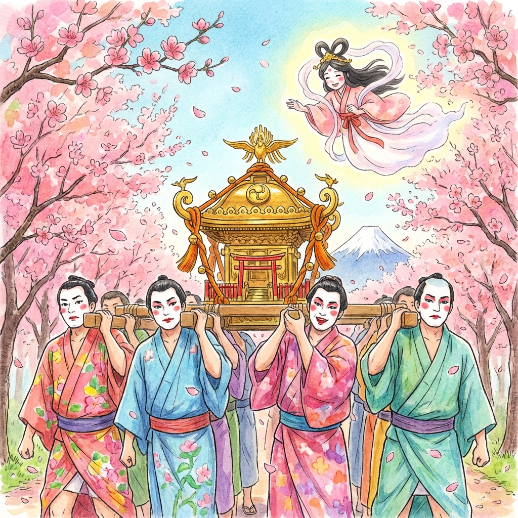 なぜこのような姿をするのかについては、面白い裏話があります。御祭神の木花開耶姫命は大変美しい女神であり、男性がそのままの姿で神輿を担ぐと、女神様が恥ずかしがってしまう、あるいは失礼にあたると考えられました。そこで、担ぎ手たちが女性の姿に変装することで、女神様をリラックスさせ、安心して神輿に乗っていただこうとしたのが始まりだと言われています。