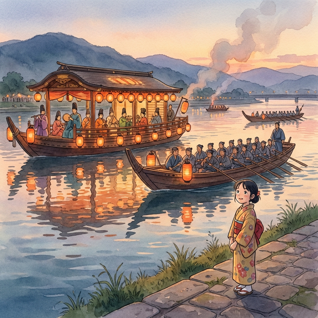 特に有名なのが、本川(旧太田川)を舞台に繰り広げられる「広島管絃祭(かんげんさい)」です。これは宮島の厳島神社で行われる管絃祭を模したもので、神霊を乗せた「御座船(ござぶね)」を「漕伝馬船(こぎでんばせん)」が曳航し、雅楽の音色とともに川を遡上する優雅かつ勇壮な神事です。